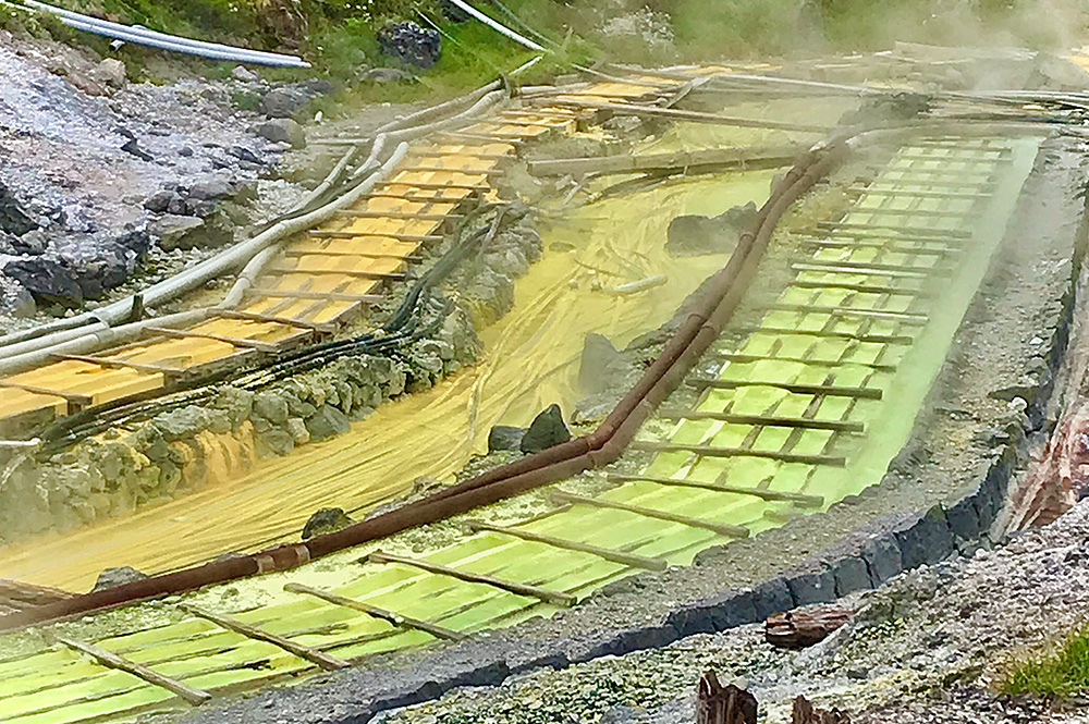 平成12年玉川温泉の「湯ノ花」に注目したのが弊社の高橋会長です。高橋は化学を専攻し、数々のプラント事業を経て独立し、玉川温泉の湯ノ花を精製する技術開発により「人工北投石」を作り出した「生みの親」です。では何故、精製する必要があったのでしょうか?それは湯ノ花の中には、良い成分も有れば、悪い成分も含まれているのです。特に酸であったり、イオウ、重金属等、の成分を除去しなくては加工できない事がわかったのです。