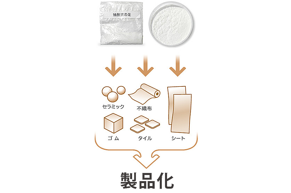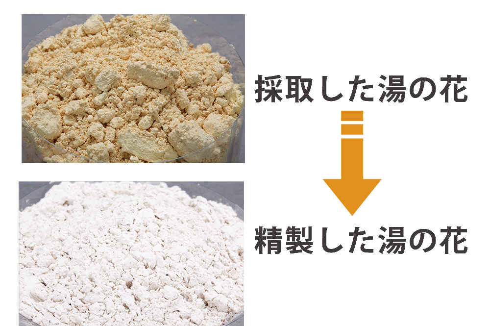 何百回もの試作を試みようやく「精製湯の花」が誕生することにより、初めて、不織布に練り込み寝具が出来たり、ゴムに練り込む事で美容業界の製品になったり、土と一緒に焼き上げる事でセラミックやタイルが出来上がり岩盤ベット・ホルミシスルームが全国のスパ施設や治療院などで活躍・特殊加工でシートに貼り付ける事により衣類・サポータ等々様々な商品が作られいろいろな現場で活躍しています。